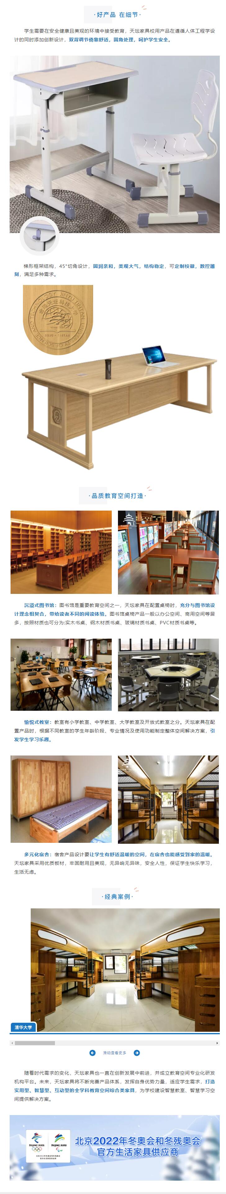 自上世紀起,天壇家具一直致力于為學校打造理想教學空間。多年以來,天壇家具已擁有教育體系產品96種,包含圖書館50種、教室14種、公寓26種、餐廳6種,并具備豐富的專業知識和經驗,長期為國內知名中小學、大學、培訓機構、企業宿舍等行業客戶提供專業化的高品質服務。